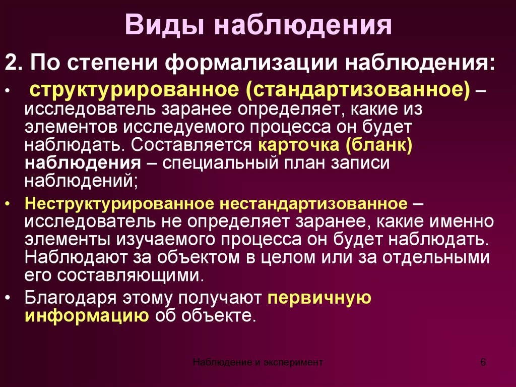 2. По степени формализации наблюдения:структурированное (стандартизованное) –