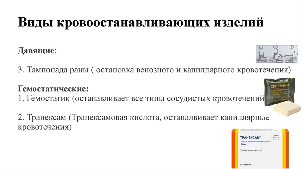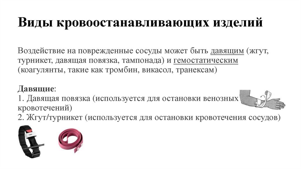 Воздействие на поврежденные сосуды может быть давящим (жгут,турникет, давящая повязка, тампонада) и гемостатическим