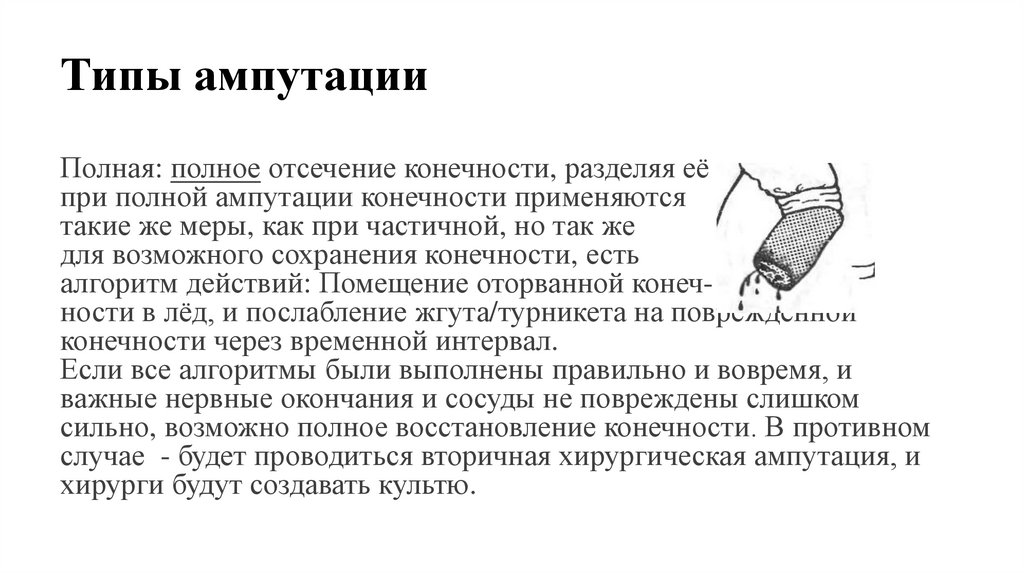 Полная: полное отсечение конечности, разделяя еёпри полной ампутации конечности применяются
