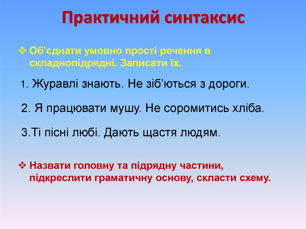 Об'єднати умовно прості речення вскладнопідрядні. Записати їх.