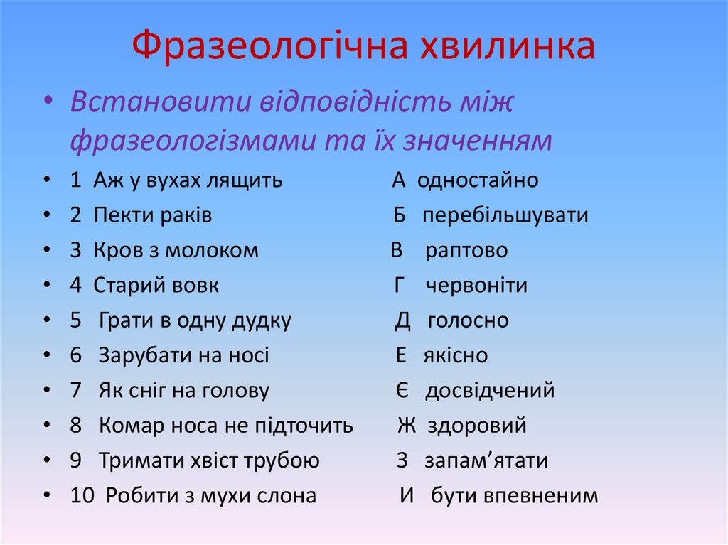 • Встановити відповідність міжфразеологізмами та їх значенням