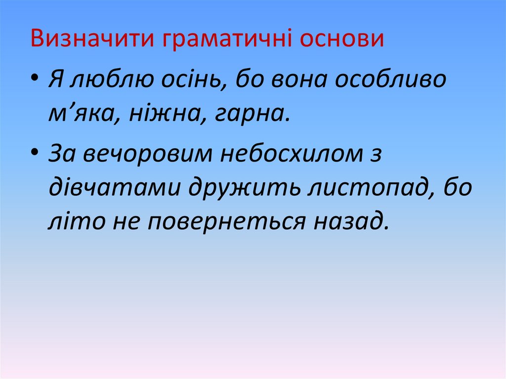 Визначити граматичні основи• Я люблю осінь, бо вона особливо