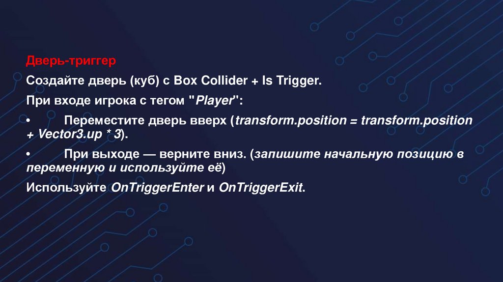 Дверь-триггерСоздайте дверь (куб) с Box Collider + Is Trigger.