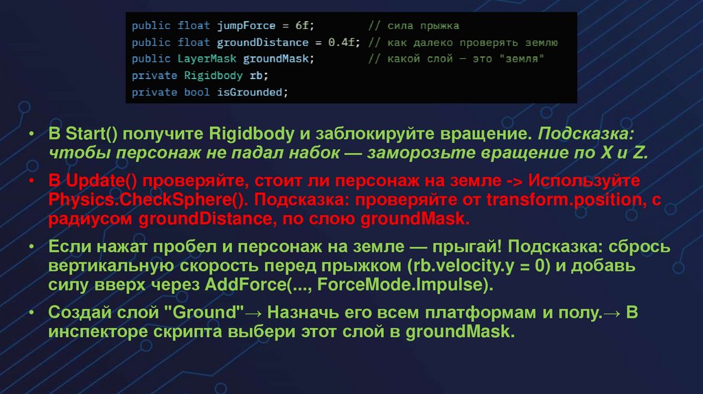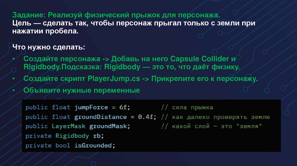 Задание: Реализуй физический прыжок для персонажа.Цель — сделать так, чтобы персонаж прыгал только с земли при