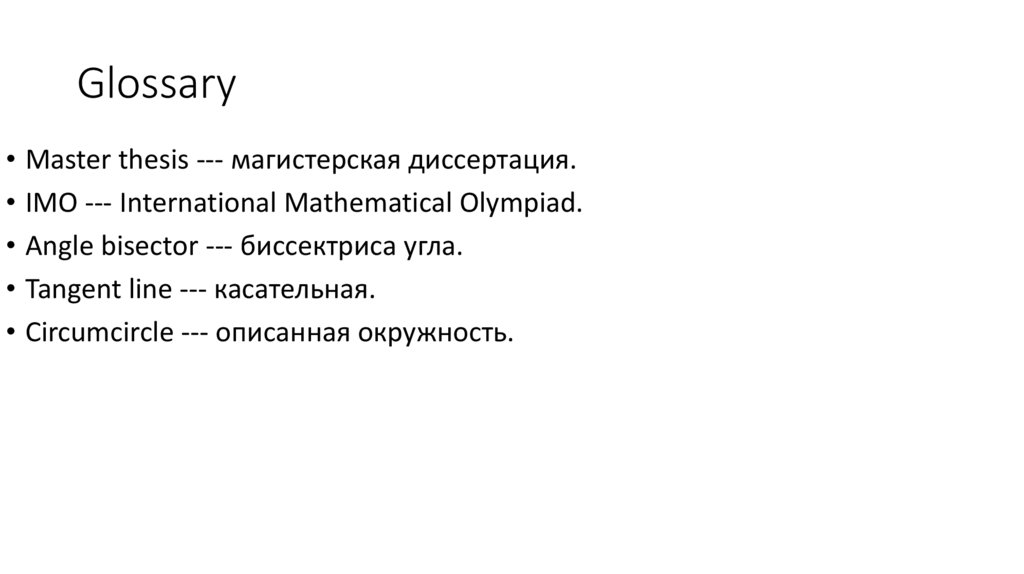 • Master thesis --- магистерская диссертация.• IMO --- International Mathematical Olympiad.
