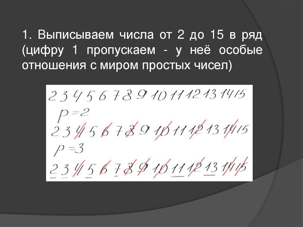 1. Выписываем числа от 2 до 15 в ряд(цифру 1 пропускаем - у неё особые