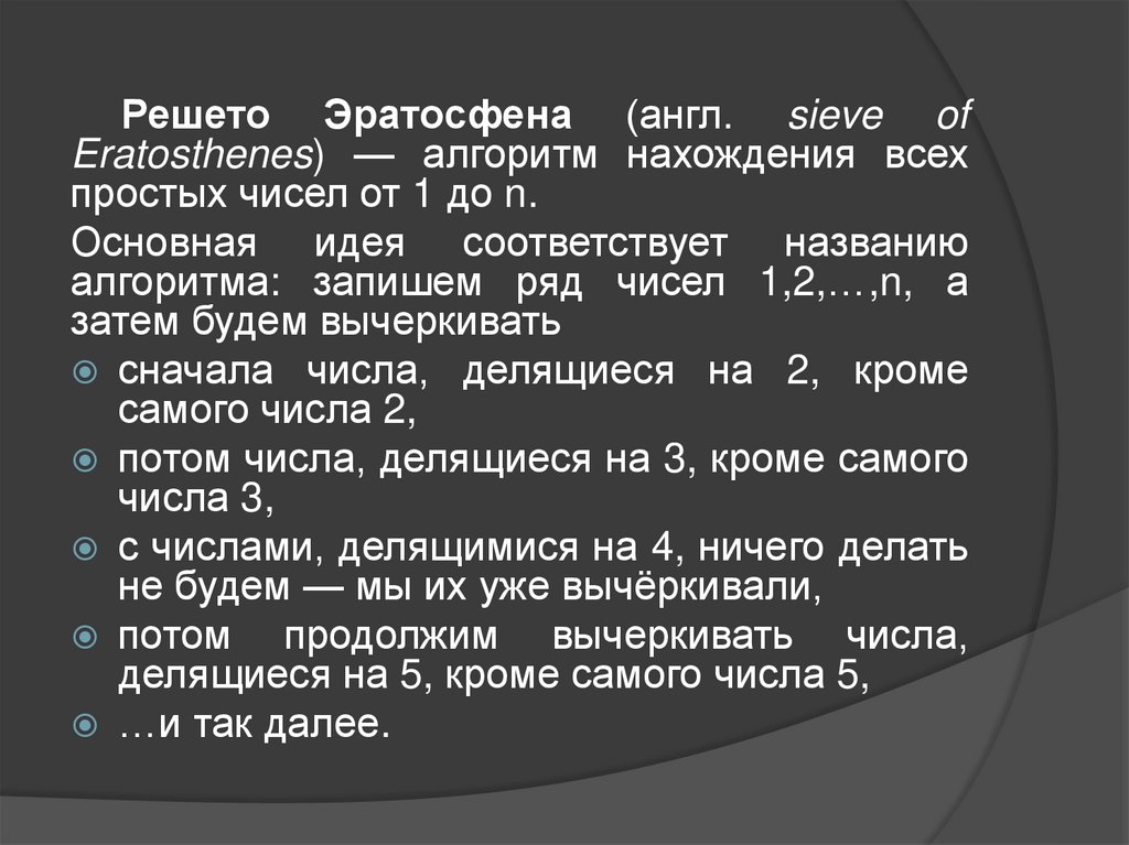 Решето Эратосфена (англ. sieve ofEratosthenes) — алгоритм нахождения всех