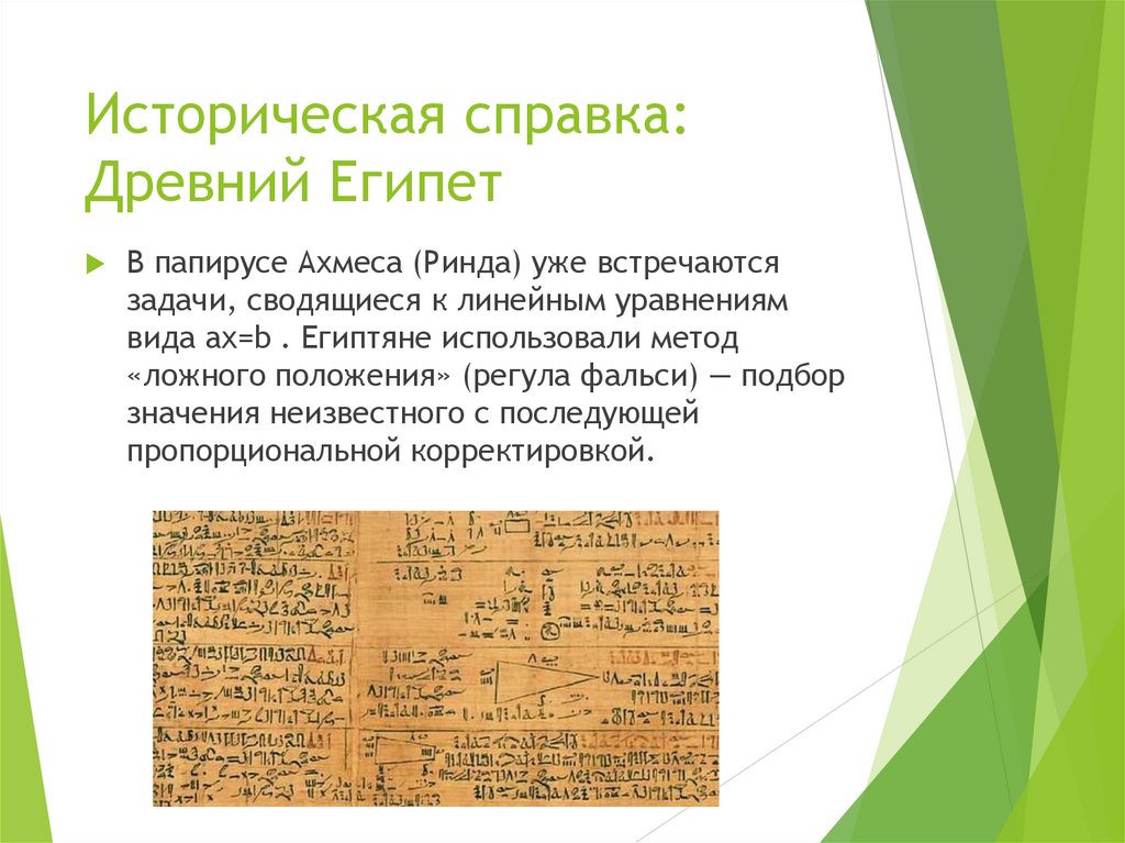 В папирусе Ахмеса (Ринда) уже встречаютсязадачи, сводящиеся к линейным уравнениям