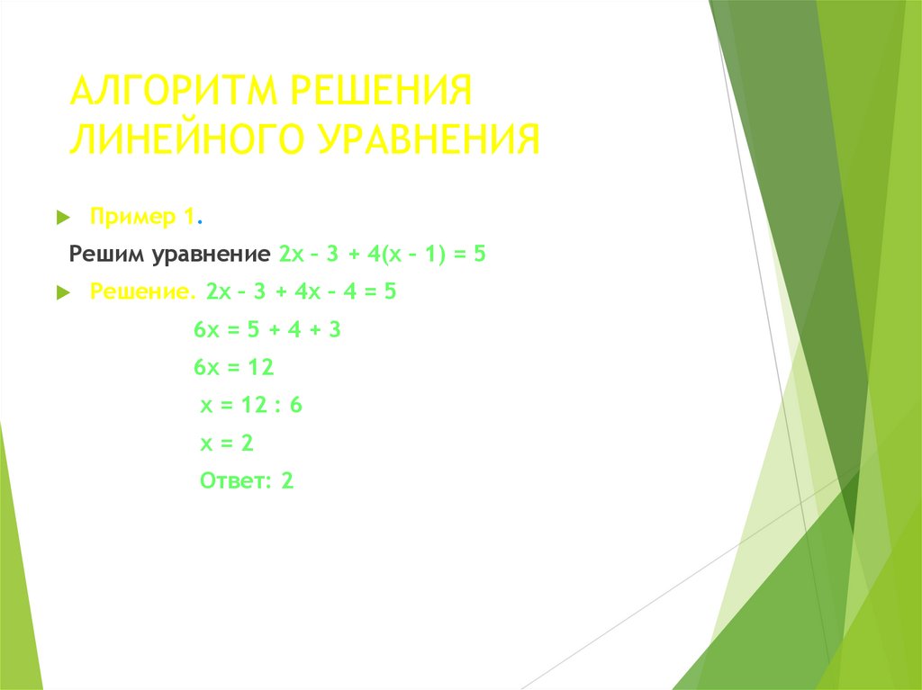 Пример 1.Решим уравнение 2x – 3 + 4(x – 1) = 5