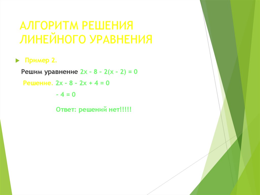 Пример 2.Решим уравнение 2x – 8 – 2(x – 2) = 0