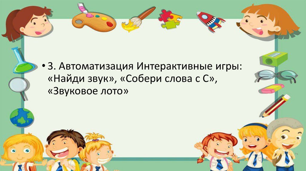 • 3. Автоматизация Интерактивные игры:«Найди звук», «Собери слова с С»,