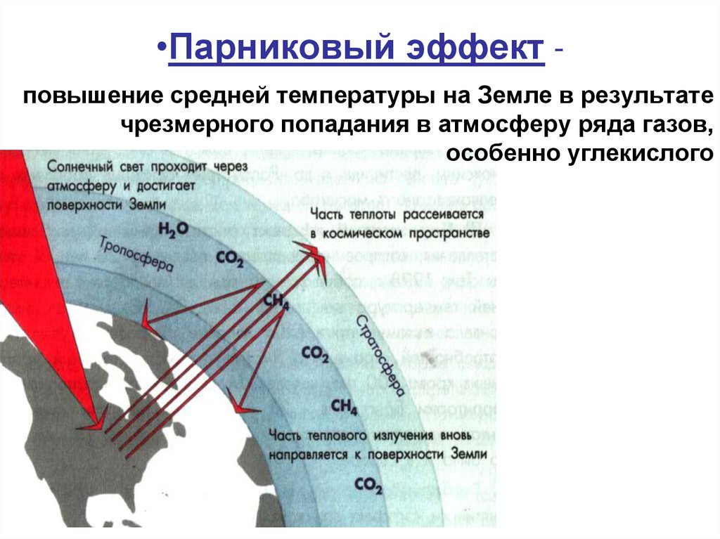 •Парниковый эффект повышение средней температуры на Земле в результатечрезмерного попадания в атмосферу ряда газов,