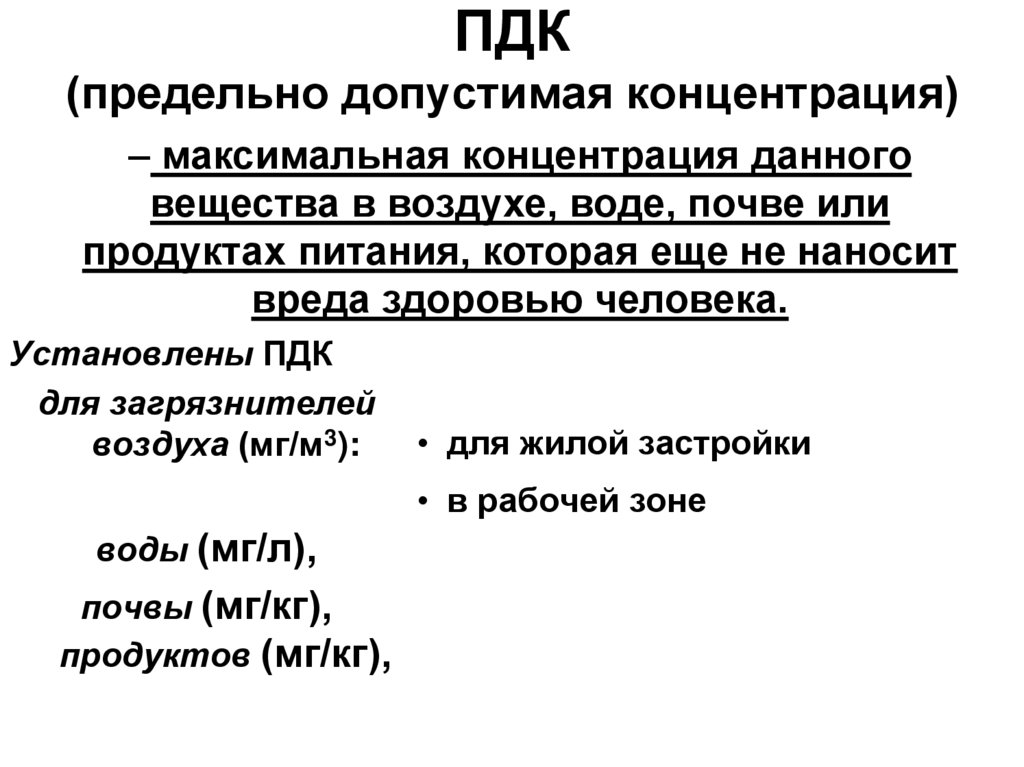 – максимальная концентрация данноговещества в воздухе, воде, почве или