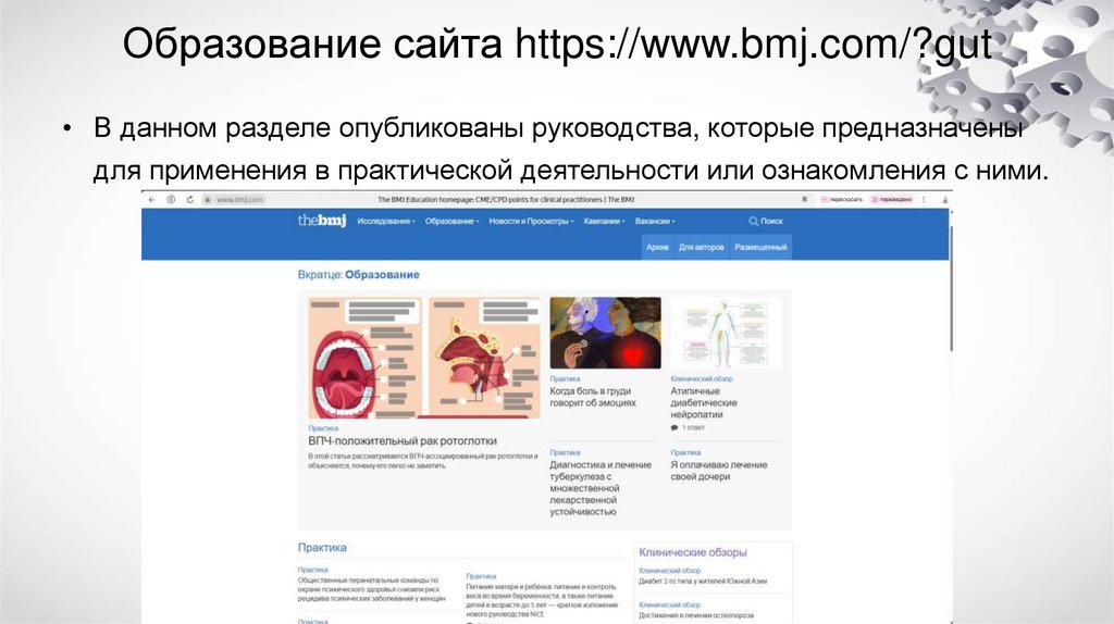 Образование сайта https://www.bmj.com/?gut• В данном разделе опубликованы руководства, которые предназначены