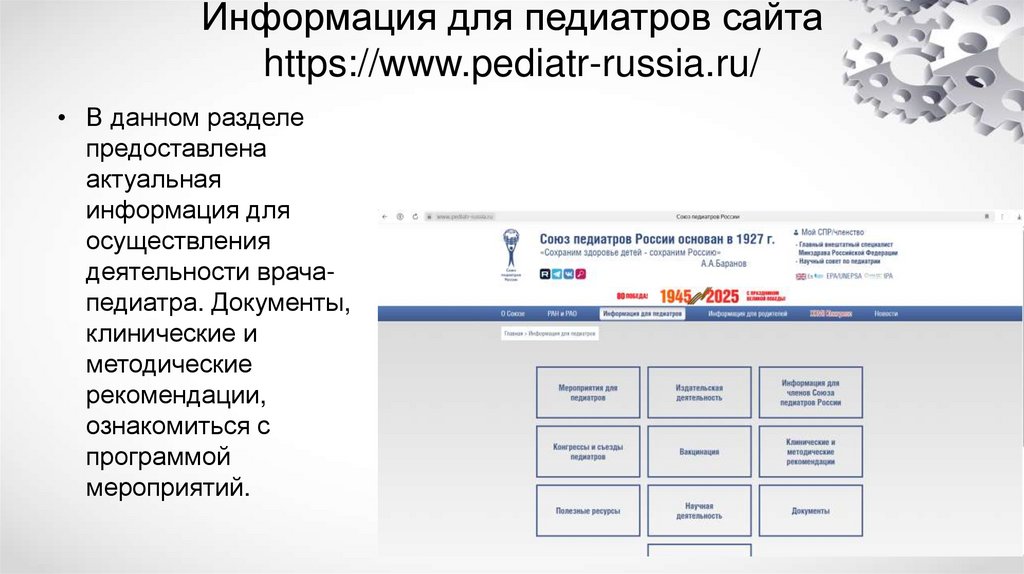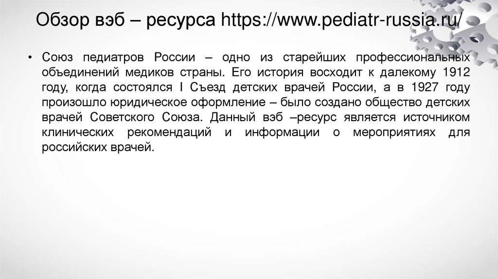 Обзор вэб – ресурса https://www.pediatr-russia.ru/• Союз педиатров России – одно из старейших профессиональных