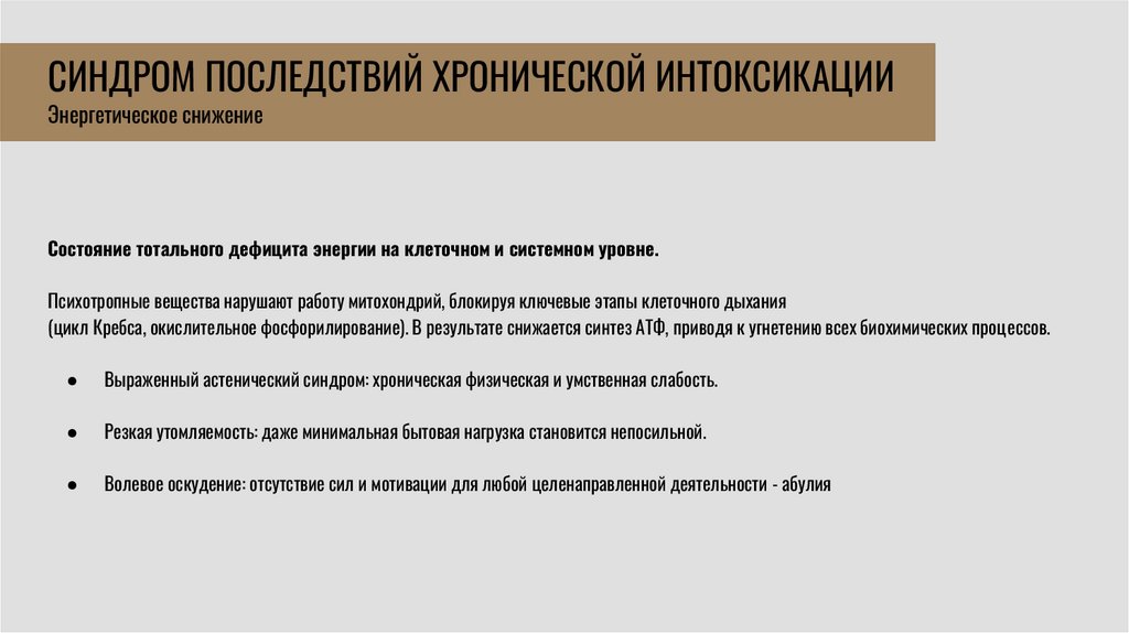 СИНДРОМ ПОСЛЕДСТВИЙ ХРОНИЧЕСКОЙ ИНТОКСИКАЦИИЭнергетическое снижение
