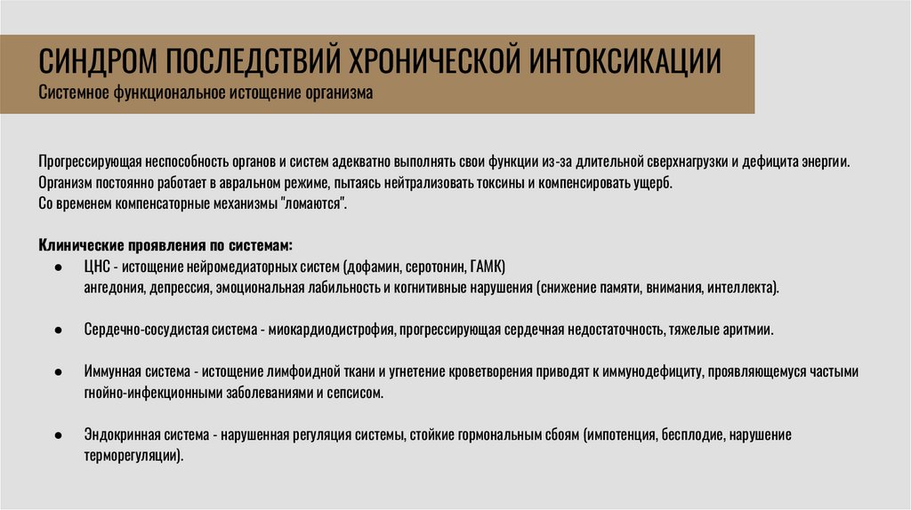 СИНДРОМ ПОСЛЕДСТВИЙ ХРОНИЧЕСКОЙ ИНТОКСИКАЦИИСистемное функциональное истощение организма