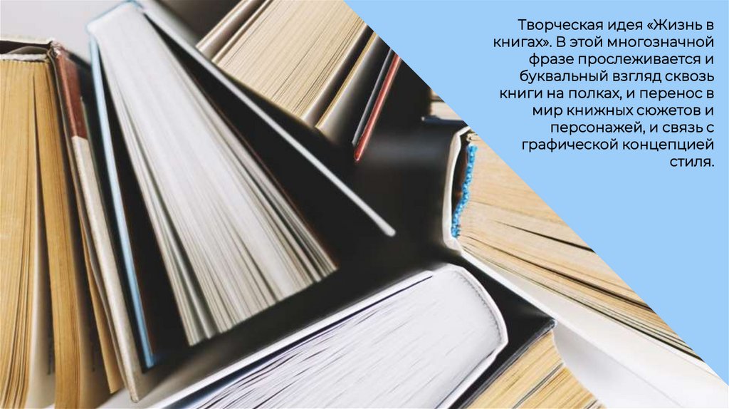 12. Творческая идея «Жизнь в книгах». В этой многозначной фразе прослеживается и буквальный взгляд сквозь книги на полках, и