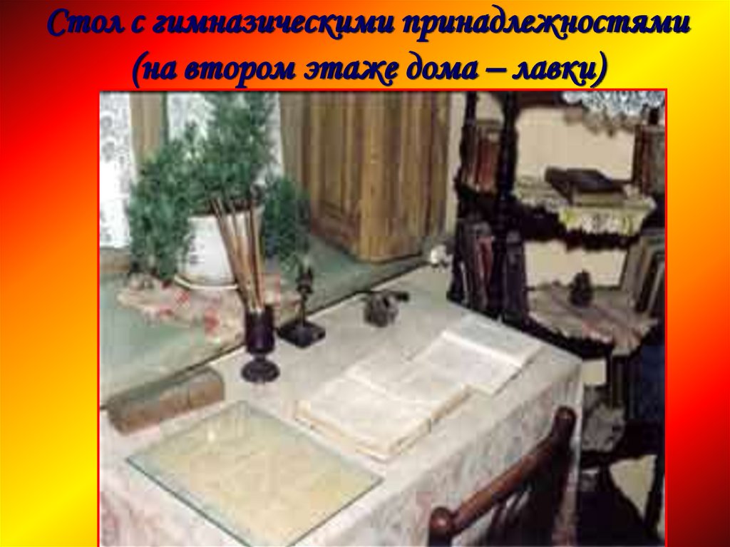 7. Стол с гимназическими принадлежностями (на втором этаже дома – лавки)