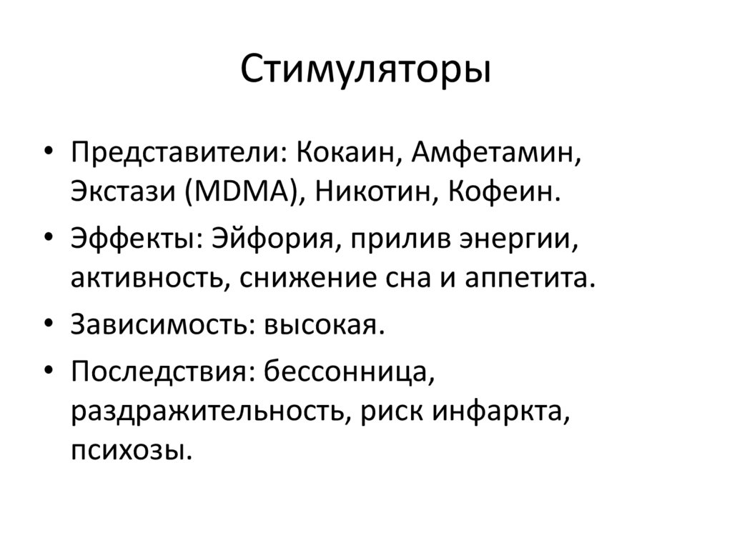 Стимуляторы• Представители: Кокаин, Амфетамин,