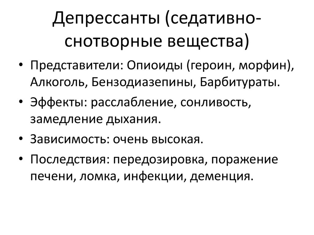 Депрессанты (седативноснотворные вещества)• Представители: Опиоиды (героин, морфин),