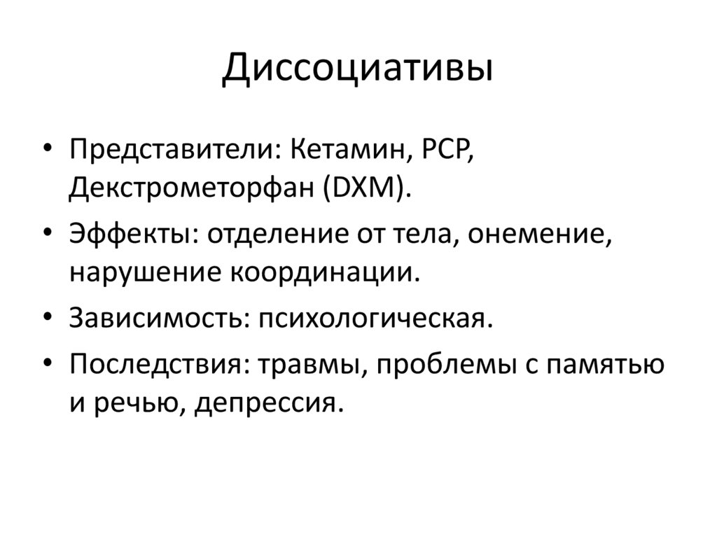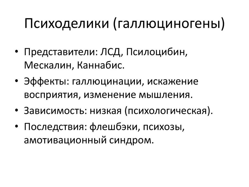 Психоделики (галлюциногены)• Представители: ЛСД, Псилоцибин,