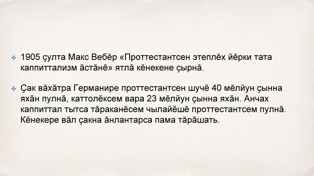 ✤ 1905 ҫулта Макс Вебӗр «Проттестантсен этеплӗх йӗрки татакаппиттализм ӑстӑнӗ» ятлӑ кӗнекене ҫырнӑ.
