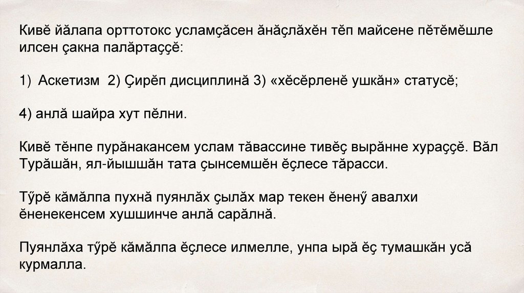 1) Аскетизм 2) Ҫирӗп дисциплинӑ 3) «хӗсӗрленӗ ушкӑн» статусӗ;