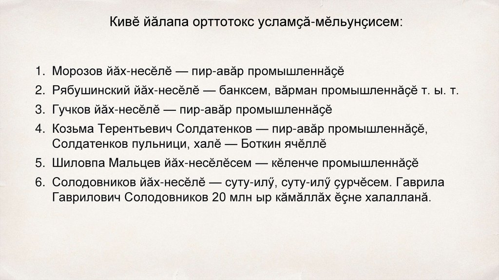 Кивӗ йӑлапа орттотокс усламҫă-мӗльунҫисем:1. Морозов йăх-несĕлӗ — пир-авăр промышленнăҫĕ