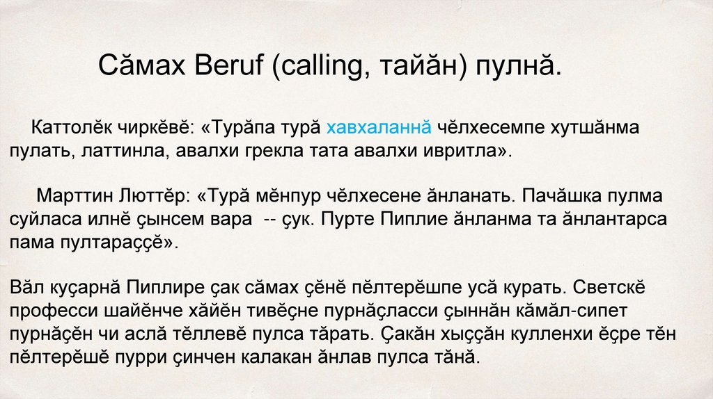 Сӑмах Beruf (calling, тайӑн) пулнӑ.Каттолӗк чиркӗвӗ: «Турӑпа турӑ хавхаланнӑ чӗлхесемпе хутшӑнма