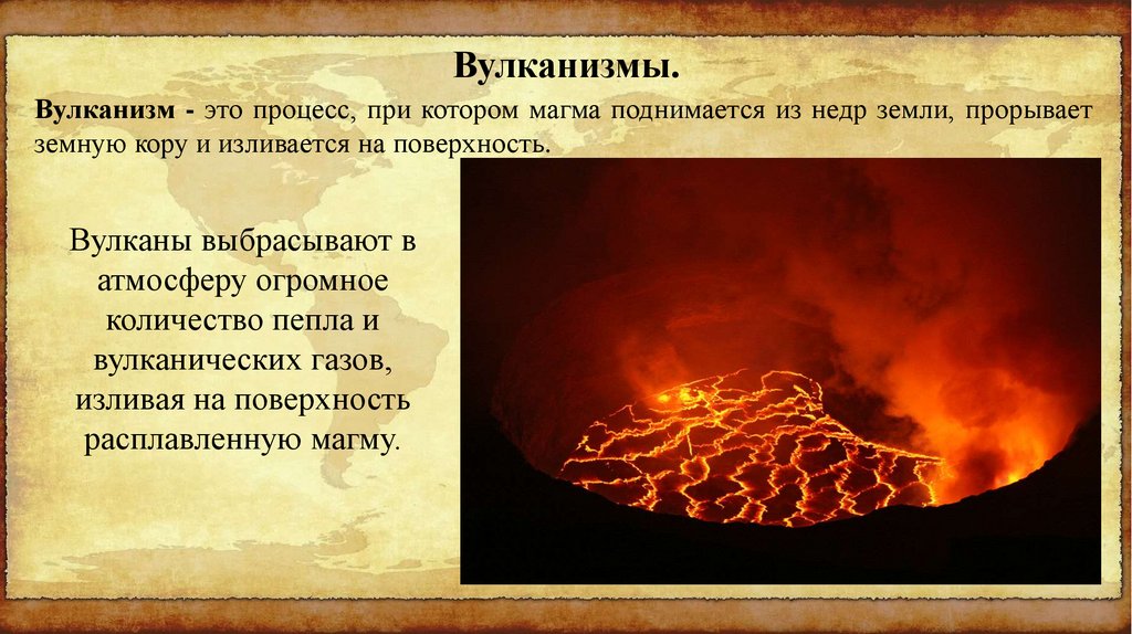 Вулканизмы.Вулканизм - это процесс, при котором магма поднимается из недр земли, прорывает
