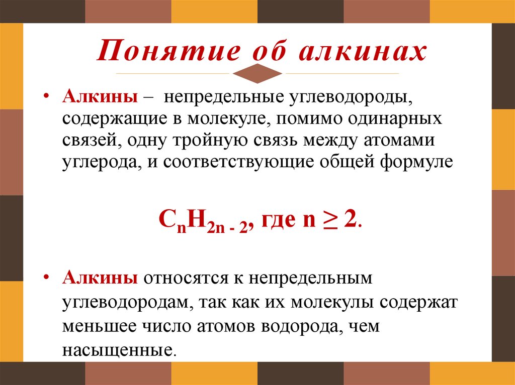 Понятие об алкинах• Алкины – непредельные углеводороды,