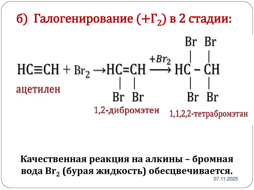 б) Галогенирование (+Г2) в 2 стадии:Качественная реакция на алкины – бромная