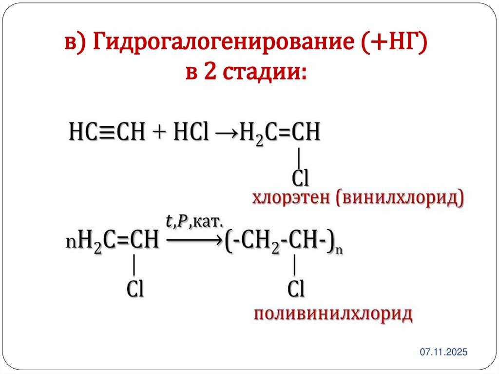 в) Гидрогалогенирование (+НГ)в 2 стадии: