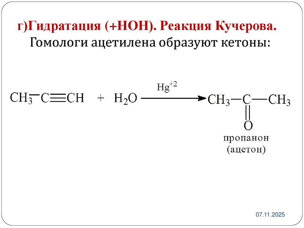г)Гидратация (+НОН). Реакция Кучерова.Гомологи ацетилена образуют кетоны: