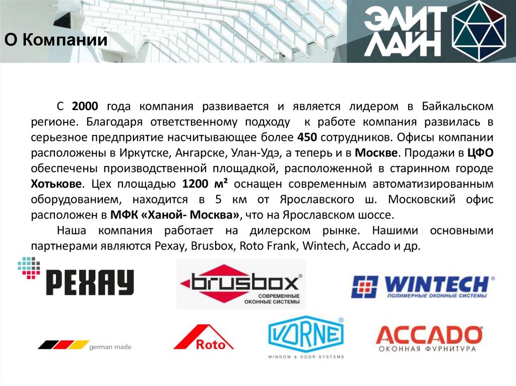 партнерами являются Рехау, Brusbox, Roto Frank, Wintech, Accado и др.