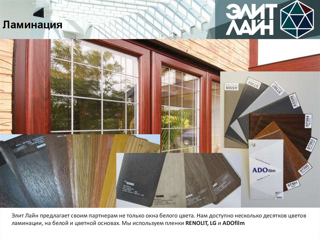 ЛаминацияЭлит Лайн предлагает своим партнерам не только окна белого цвета. Нам доступно несколько десятков цветов