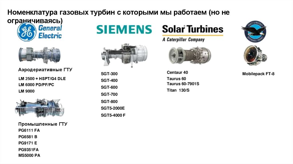 5. Номенклатура газовых турбин с которыми мы работаем (но не ограничиваясь)