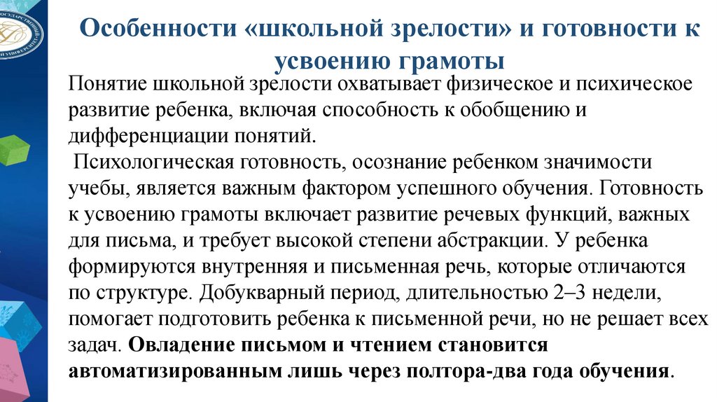 • Навыки чтения и письма.