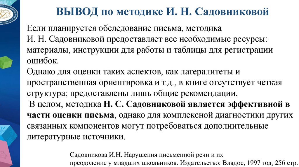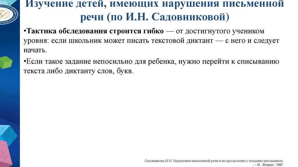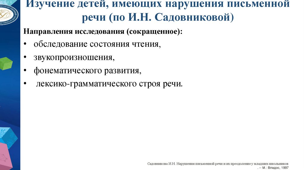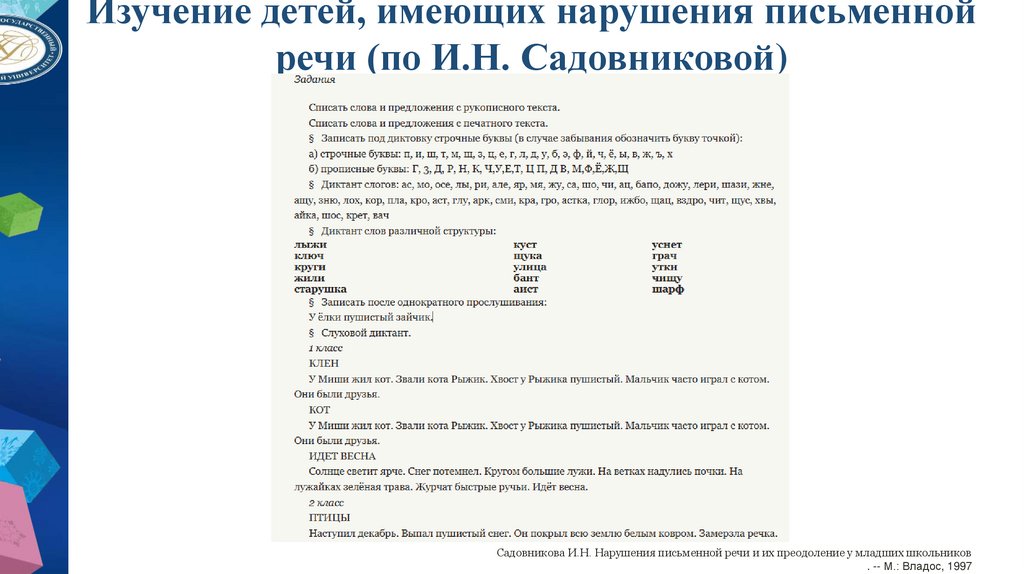 Изучение детей, имеющих нарушения письменнойречи (по И.Н. Садовниковой)