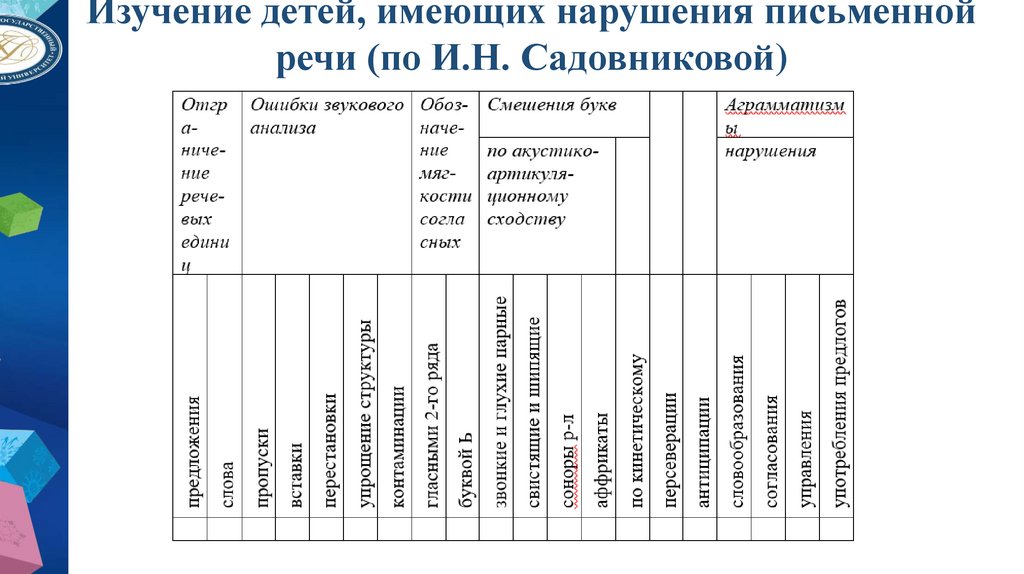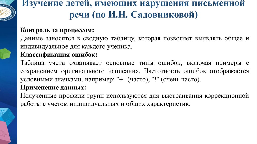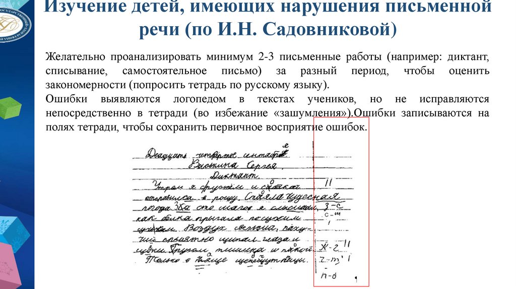 8. Изучение детей, имеющих нарушения письменной речи (по И.Н. Садовниковой).