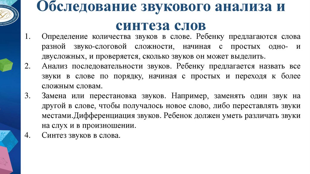 • Звуковой анализ и синтез слов;