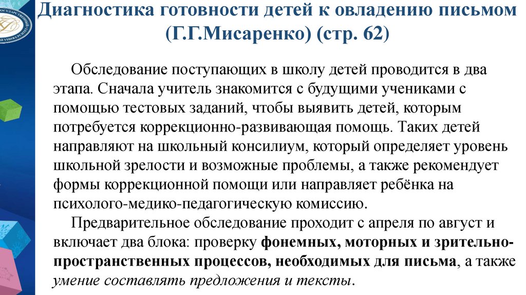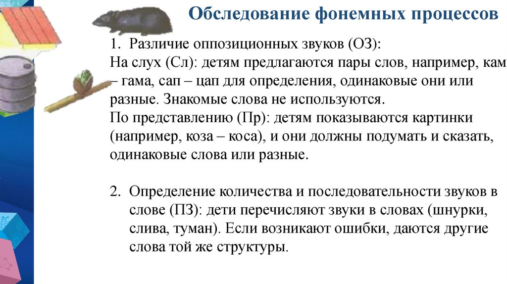 (Г.Г.Мисаренко): обследование фонематических процессов,