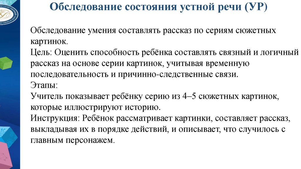 Обследование состояния устной речи (УР)Обследование умения составлять рассказ по сериям сюжетных