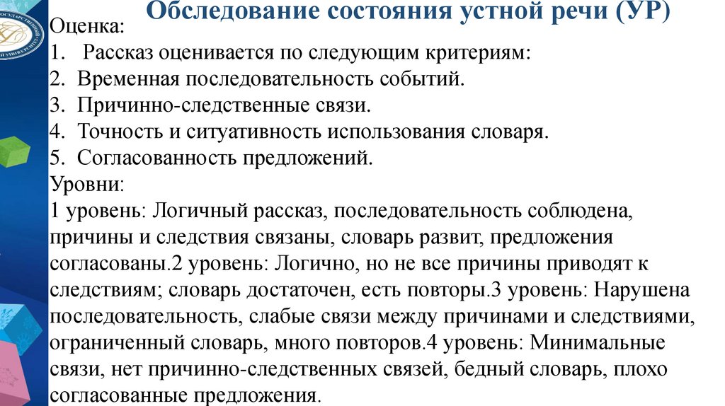 Обследование состояния устной речи (УР)Оценка: