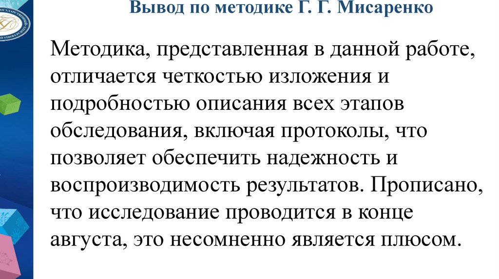 Вывод по методике Г. Г. МисаренкоМетодика, представленная в данной работе,