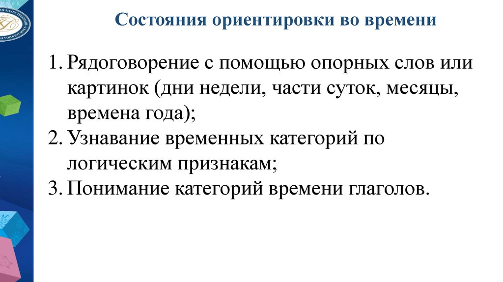 • Временные представления (понимание последовательности, ритма,