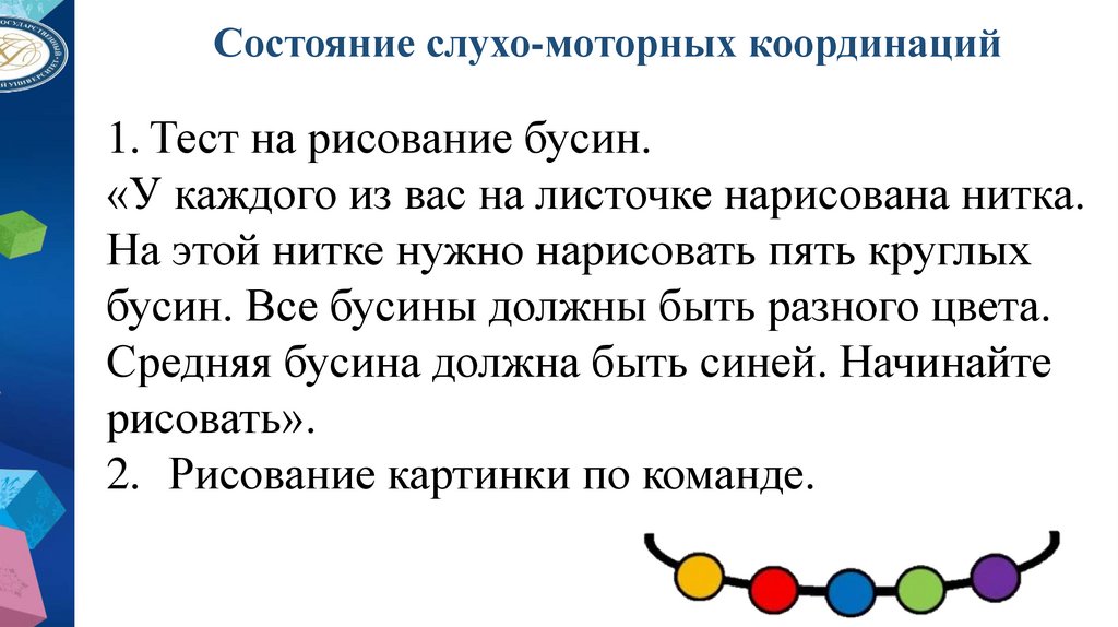 • Двигательные функции руки и слухо-моторная координация;