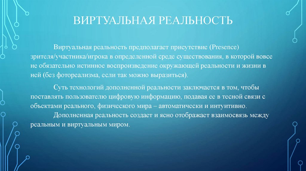 ВИРТУАЛЬНАЯ РЕАЛЬНОСТЬВиртуальная реальность предполагает присутствие (Presence)