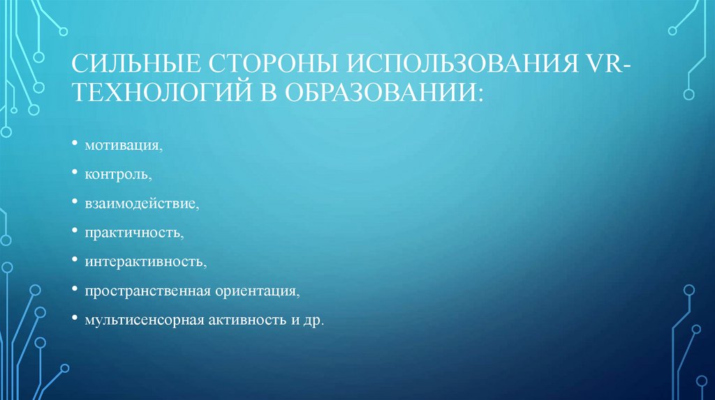 СИЛЬНЫЕ СТОРОНЫ ИСПОЛЬЗОВАНИЯ VRТЕХНОЛОГИЙ В ОБРАЗОВАНИИ:• мотивация,